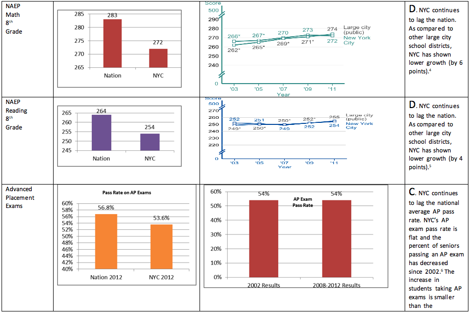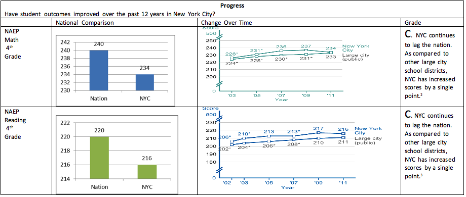 Have you cherry-picked data? These are the real numbers and we have sourced all the data. In fact, some data that were not included show even greater under-performance in New York City schools over the past 12 years. For example, the NAEP results in science show New York City lags behind the national average by 14 points in 4th grade and by 20 points in 8th grade. [15] However, since the most recent data are from 2009 and over 4 years old we did not include them.