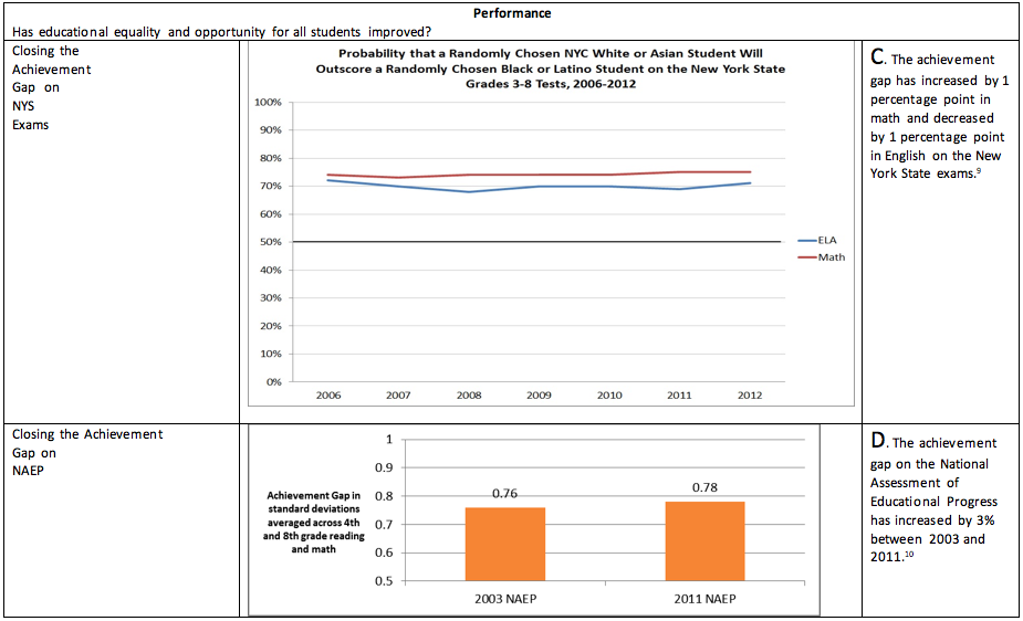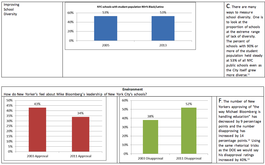 [11] http://schools.nyc.gov/NR/rdonlyres/B54A0720-E4EE-432D-A322-940346CCE61B/0/2013DemographicSnapshotPUBLIC.xlsx and http://www.nytimes.com/interactive/2012/05/11/nyregion/segregation-in-new-york-city-public-schools.html?_r=0 showing that “Black isolation in schools has persisted even as residential segregation has declined.” https://dianeravitch.net/2013/09/08/insider-at-bloomberg-doe-spills-the-beans-about-failed-policies/ has data on the extreme inequities in school outcomes where only a small handful of NYC produce outcomes at the national average. Finally, the Independent Budget Office has shown that from 2002-2011 school integration has remained flat http://www.ibo.nyc.ny.us/iboreports/printnycbtn11.pdf