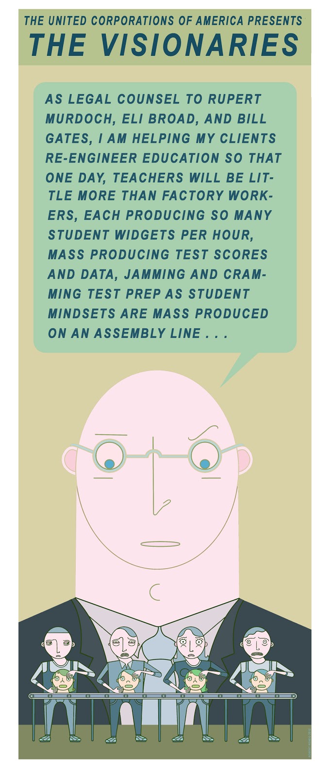 The big-money foundations –– Gates, Walton, Robertson, Bradley, Broad, and Koret, to name a few –– all push “reforms” that are tied to “markets” and “global competitiveness.” They get support from the big bankers (Goldman, JP Morgan, etc), hedge-funders, and the U.S. Chamber of Commerce. They are aided and abetted by “educational” organizations like the ACT, the College Board, and Achieve, Inc.