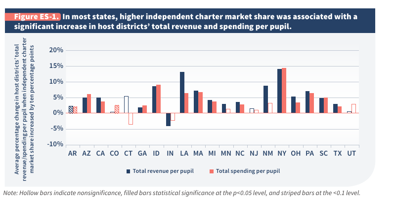 Finding 1. In most states, an increase in the percentage of students attending independent charter schools was associated with a significant increase in host districts’ total revenue and spending per pupil.