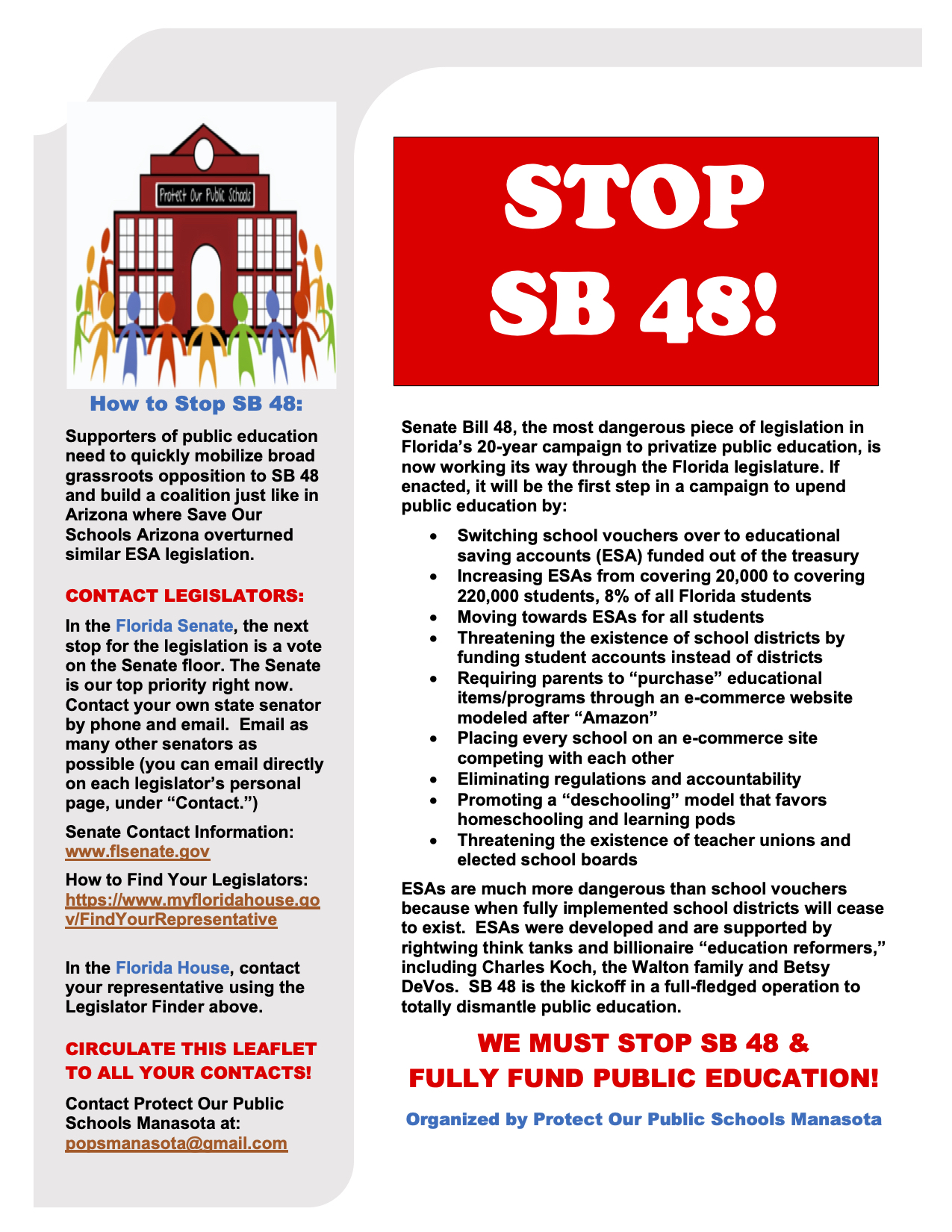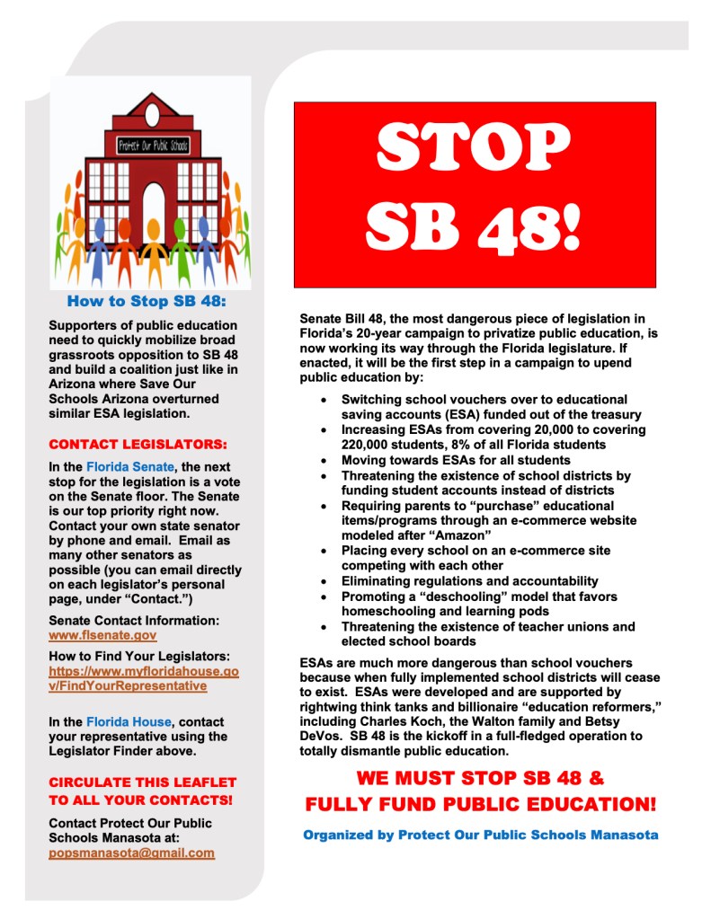 Thank you for posting this. As the author of this “Stop SB 48 leaflet, I would like to call readers’ attention to the fact that Protect Our Public Schools (POPS) Manasota has a “Stop SB 48 Tool Kit” on its website, http://www.popsmanasota.org. Also check out two articles I wrote for “Critical Times,” one on the dangers of SB 48 and the other on one of the major Florida (and national) school privatization operatives, John Kirtley, a protege of Betsy DeVos, and major pusher of all forms of school privatization including education savings accounts. The articles can be accessed on the Stop 48 tool kit website listed above as well as at http://www.criticaltimes.org. As I say in my article, Florida’s SB 48 legislation, if passed, will create the apparatus to totally privatize education in Florida. Educational savings accounts are much more dangerous than vouchers as ESAs put the funding directly with the students–what the privatizers have wanted all along.
