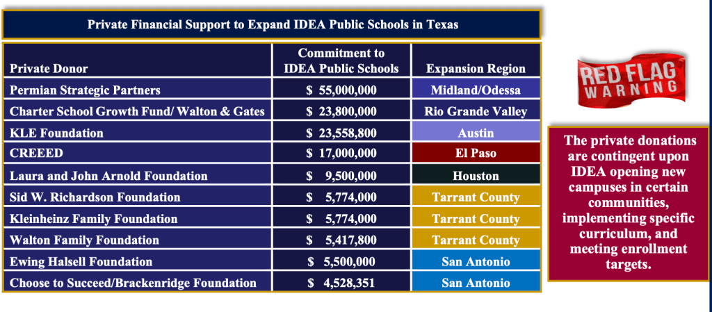The Promotion and Growth of IDEA – Private Foundations: After three years of classroom experience with Teach for America and at the age of 24, Tom Torkelson and JoAnn Gama founded the IDEA Public Schools charter network to revolutionize the education for low-income families. Since its founding, IDEA’s education model was propelled by private interests, including the Walton Family Foundation, Bill and Melinda Gates Foundation, Ewing Halsell Foundation, KLE Foundation, and the George Brackenridge Foundation. Collectively, these organizations give contingent donations to open campuses in targeted communities, implement specific curriculum, and expand enrollment. Although IDEA no longer specifies the details of its donors, prior communications reveal that IDEA was the beneficiary of over $150 million of private donations to expand in various regions of Texas.