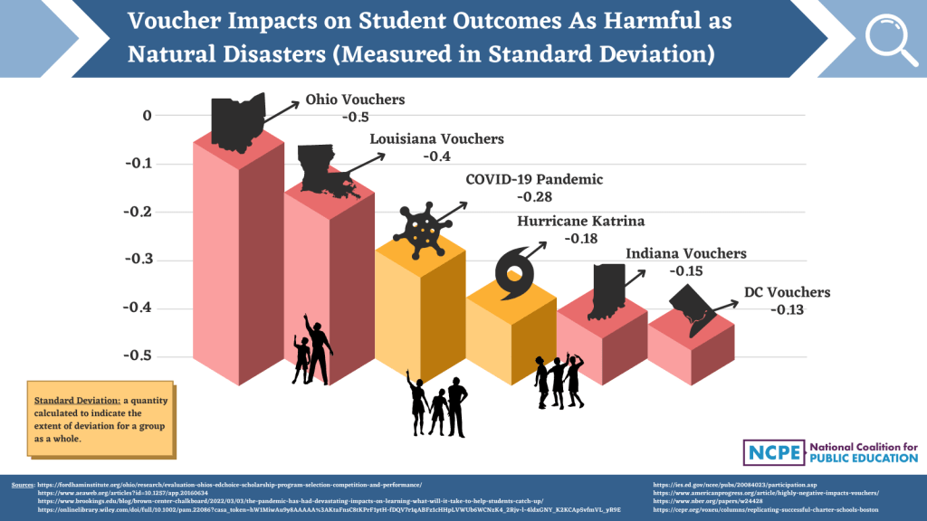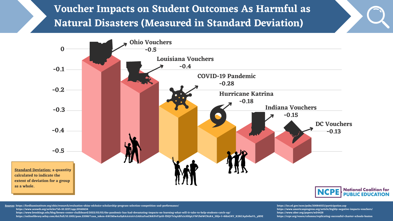 Large-scale independent studies in D.C.,Indiana, Louisiana, and Ohio show that for kids who left public schools, harmful voucher impacts actually meet or exceed what the pandemic did to test scores. That’s also a similar impact in Louisiana to what Hurricane Katrina did to student achievement back in 2005.