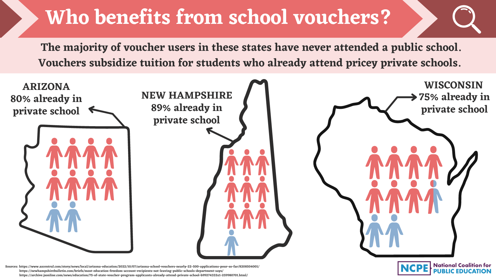 There’s another data point you need to know up front: vouchers overwhelmingly fund children who were already in private school without them. In states that have released those numbers—Arizona, New Hampshire, and Wisconsin—we know more than 75% of voucher applicants came from private schools.
