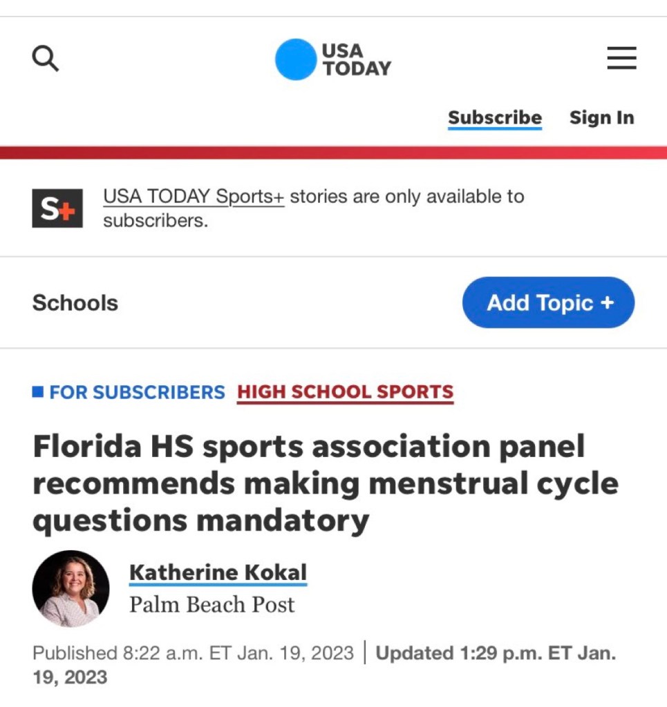 No freedom in Florida! The state where personal privacy goes to die! Soviet-style mind & body control! I’m guessing the purpose of this diktat is to check to make sure no trans women are competing in women’s sports. But there are worse things at stake her. Privacy. Freedom. An intrusive state, a government that counts your menstrual cycle. Gross!