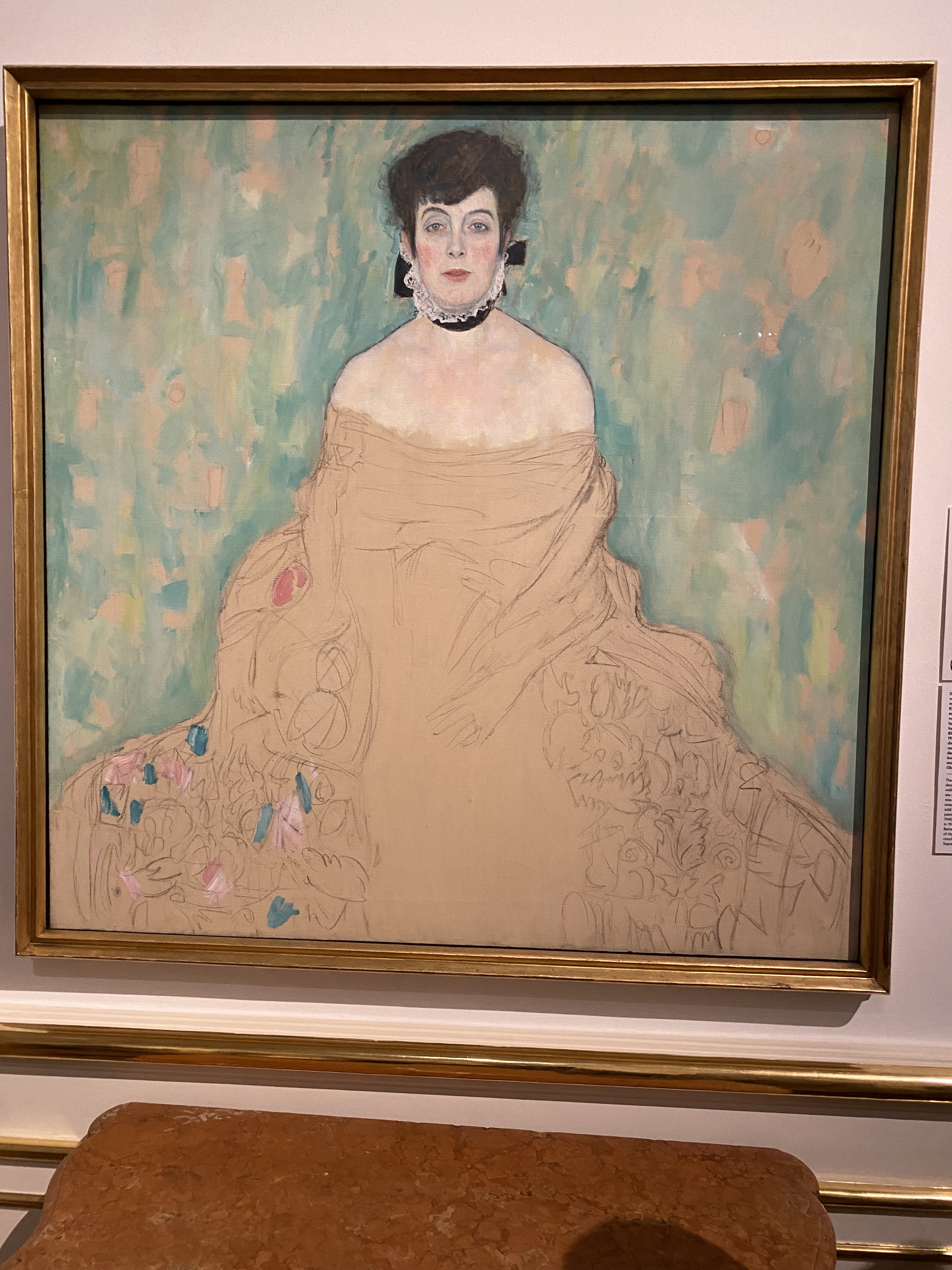 The woman painted here by Gustav Klimt, Amalie Zuckandl, died in a Nazi concentration camp. The portrait hangs in the elegant Belvedere Museum, which previously was a royal palace owned by the Hapsburgs.