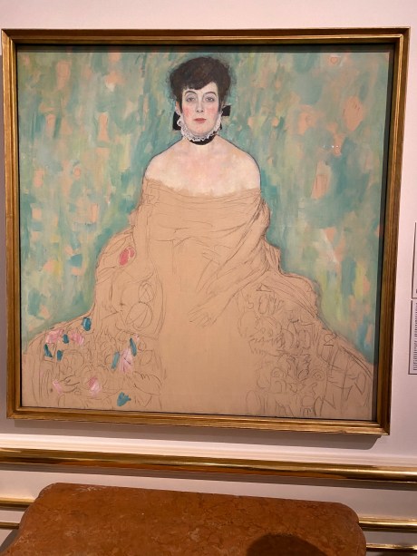 The woman painted here by Gustav Klimt, Amalie Zuckandl, died in a Nazi concentration camp. The portrait hangs in the elegant Belvedere Museum, which previously was a royal palace owned by the Hapsburgs.