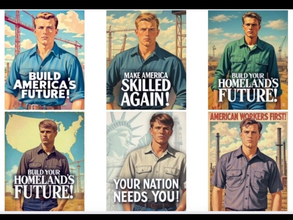 In addition to the contested use of Rockwell’s paintings, the Trump administration’s Department of Labor has used the retro images below as part of its recruitment/branding campaign (slogans like “Make America Skilled Again,” “Build America’s Future,” “American Workers First,” “Your Nation Needs You”). The DOL ran them on social media (USDOL posts on X/Twitter, Facebook and Instagram). The posters present America as an all-white nation of male workers. No diversity. Broad shoulders. Blonde hair. Open-collar. He-men. Red-blooded white American men. No Rosie the Riveter.