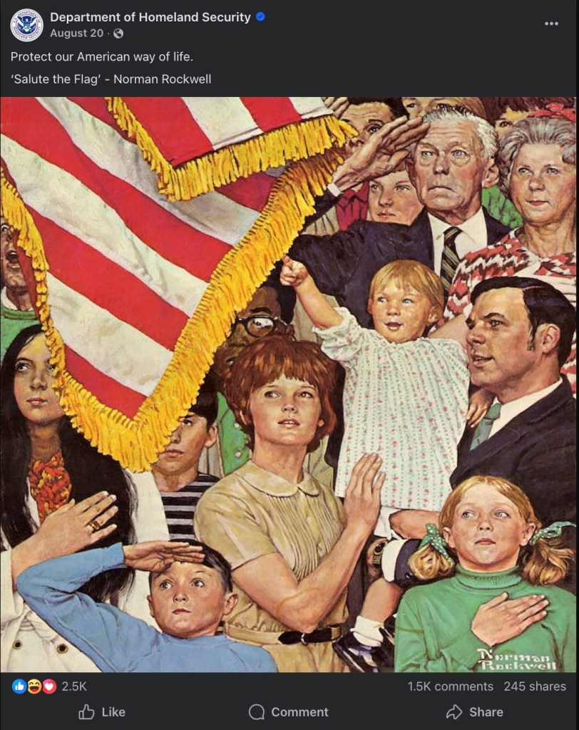 These are three Norman Rockwell paintings that recently appeared without authorization in social media posts by the U.S. Department of Homeland Security. They bore these labels: “Protect our American way of life,” “Manifest Heroism” and a quote from Calvin Coolidge, “Those who do not want to be partakers of the American spirit ought not to settle in America.”