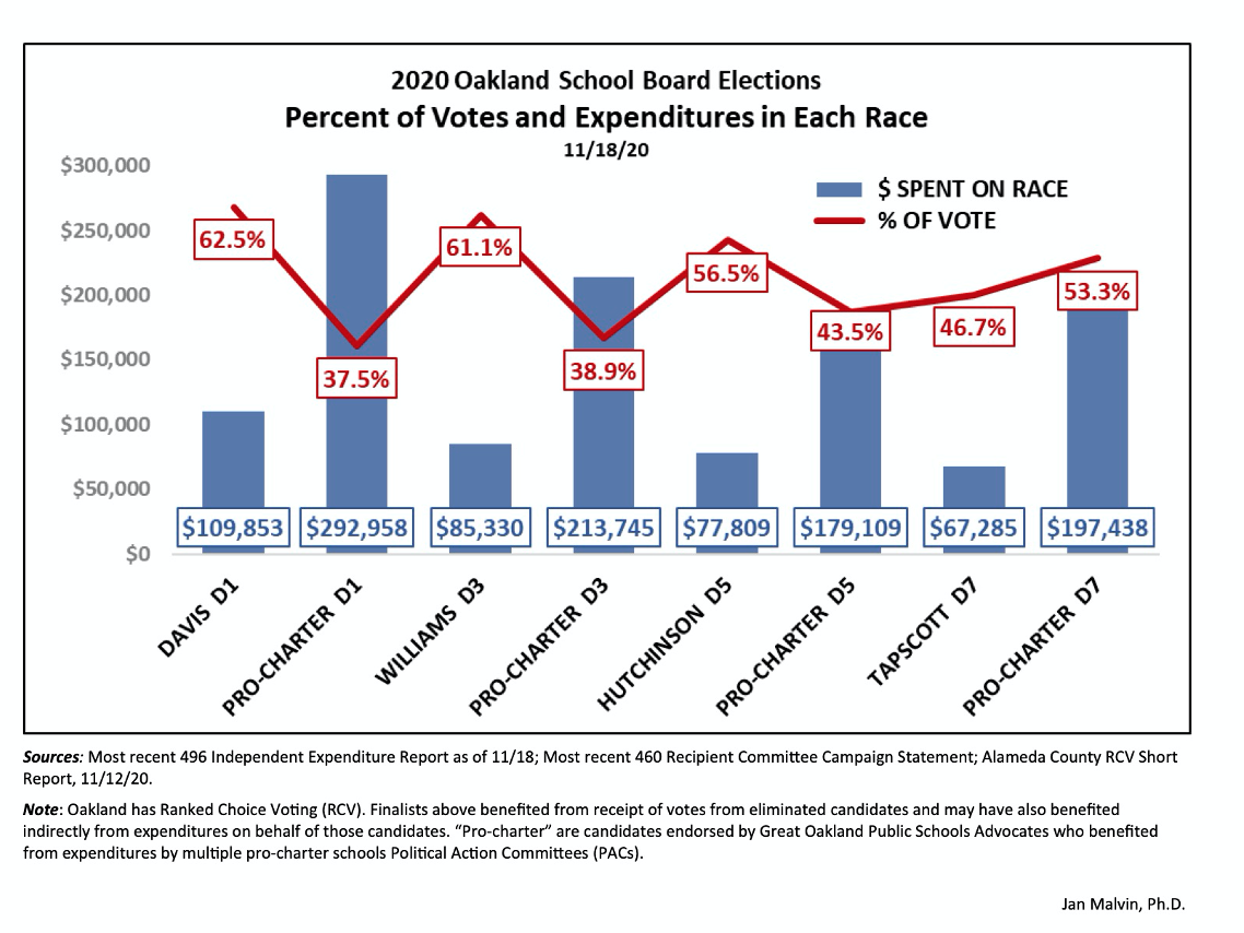 The Oakland Unified School District (OUSD), the petri dish for school privatization for the past two decades, might have an answer. I ran and was elected to the Oakland school board and served one term (1997-2000). I raised $12,000. My opponent raised about the same amount. In those days the school board elections were neighborhood races funded by local supporters. There was no out of state money or PACs involved.