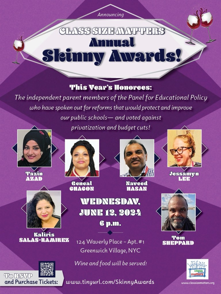 I will be there to celebrate the award winners, who are parent-members of the Board of Education who stood strong for students, teachers, and well-funded public schools.